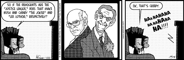 Avram, one of the great problems of Superman is that he's never had the rogue's gallery befitting a hero of is stature. On the other hand, Rumsfeld sort of looks like Toyman, and if you drew a mustache on Ari Fleisher, he'd sort of look like a thin version of the Prankster ("always annoying, rarely truly dangerous"). And of course Terra-Man, the space cowboy who fights against alien invaders like Kal-El, would be Paul Wolfowitz, but the physical similarity is non-existant. Condi Rice probably wishes she were La Encantadora ("La Encantadora uses a mysterious mist to make people believe what she wants them to believe"), but get real, girl.