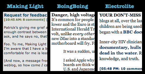 There's also the matter of column width. In Safari, with my window 962 pixels wide (not counting the scrollbar), here are how wide the text columns come out in the three blogs (measuring the longest lines I could find in my screenshots):
