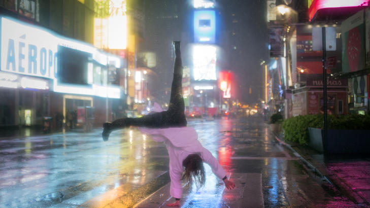 "Times Square: A solitary man walks through the deserted landmark"